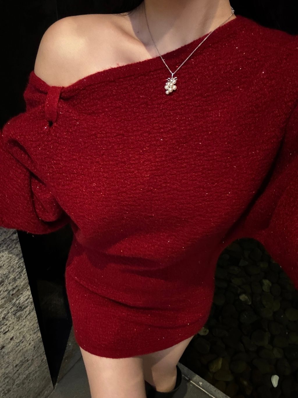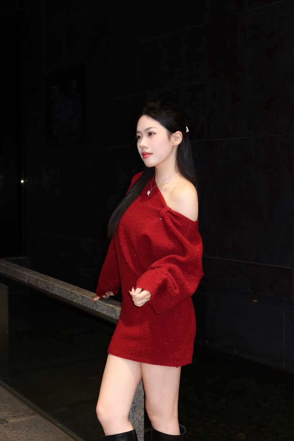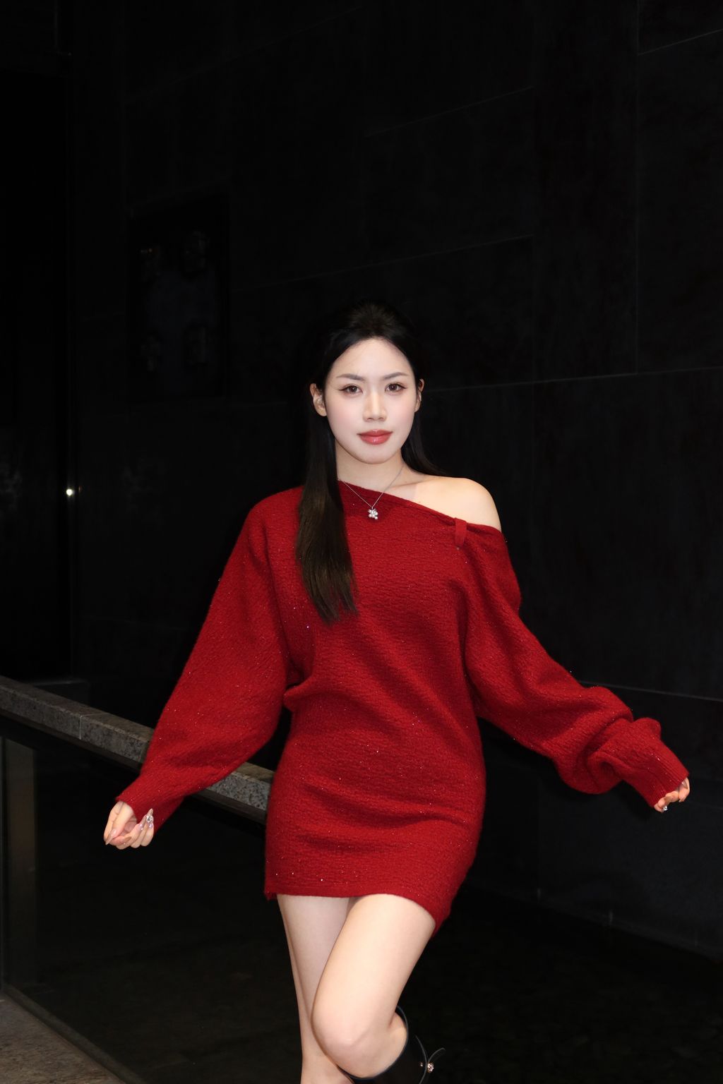 S03新年紅斜肩連身裙